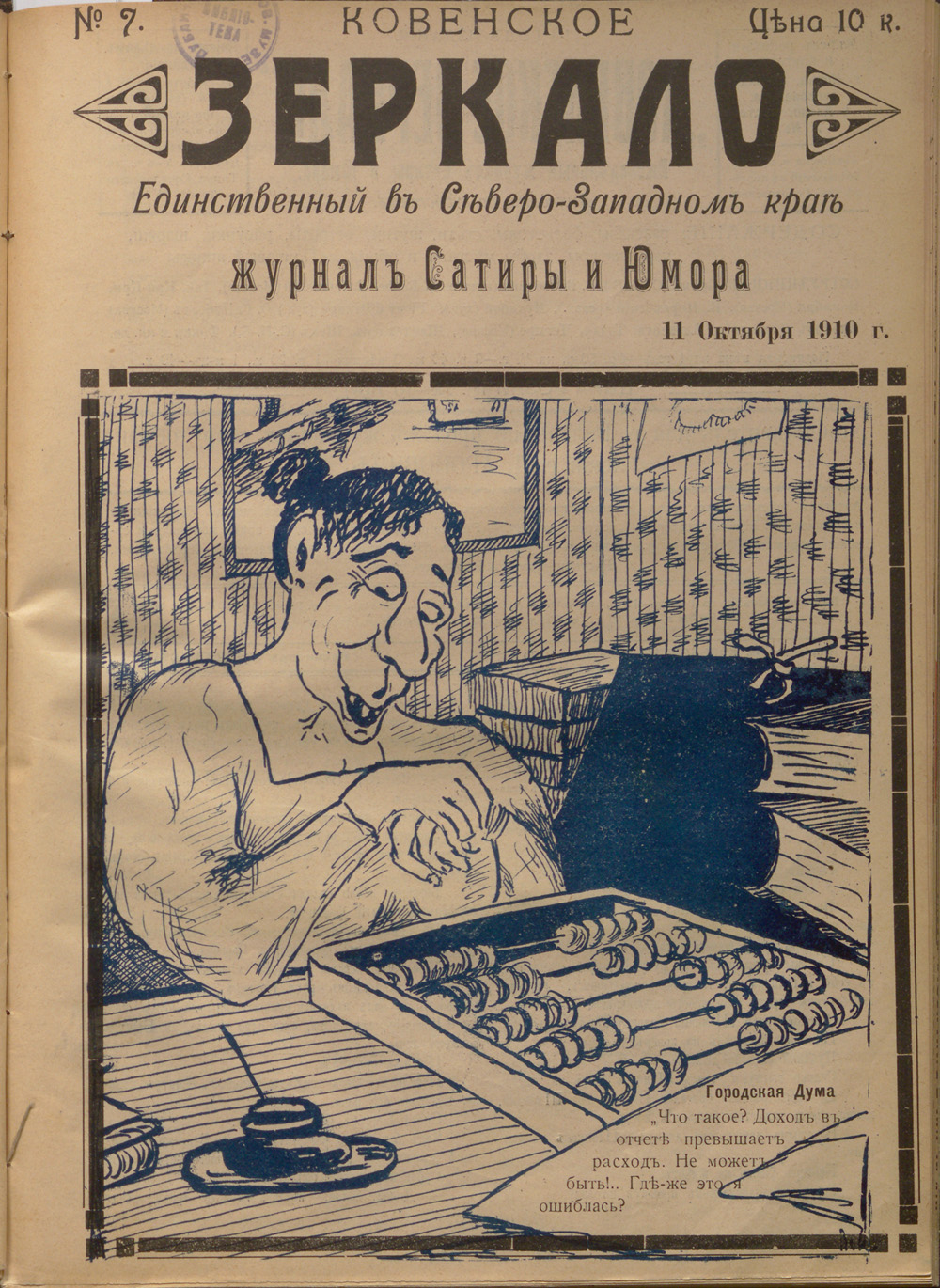 Обложка журнала «Ковенское зеркало» с рисунком В.Старевича. Надпись: «Городская дума. Что такое? Доход в отчете превышает расход. Не может быть!.. Где же это я ошиблась?» Это единственный рисунок, не подписанный псевдонимом «Мухобой», но под ним стои