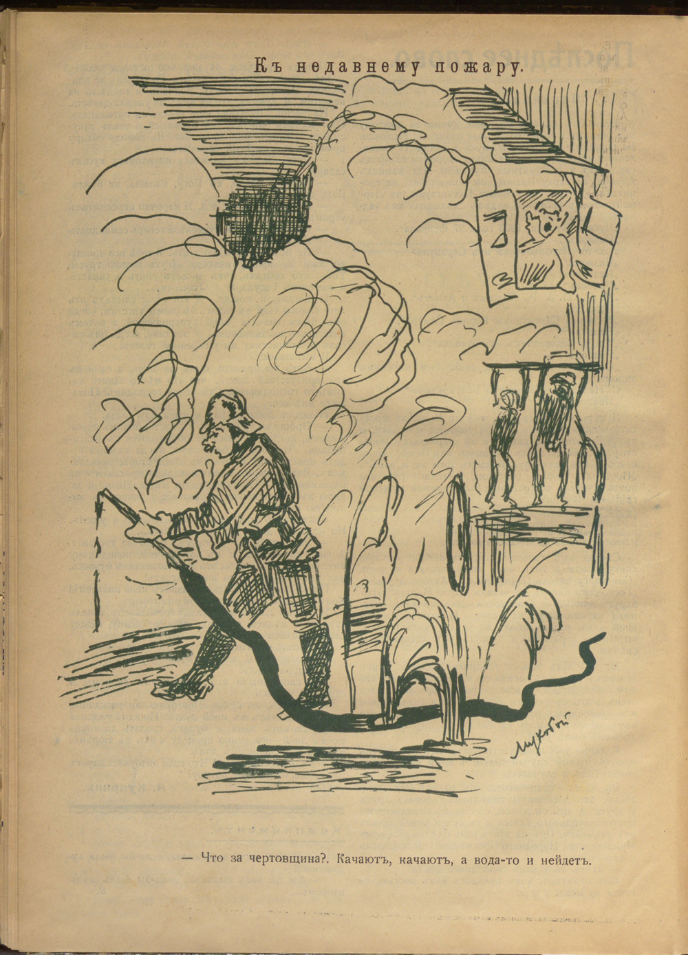 «К недавнему пожару. – Что за чертовщина? Качают, качают, а вода-то и нейдет». Иллюстрация В.Старевича из журнала «Ковенское зеркало».