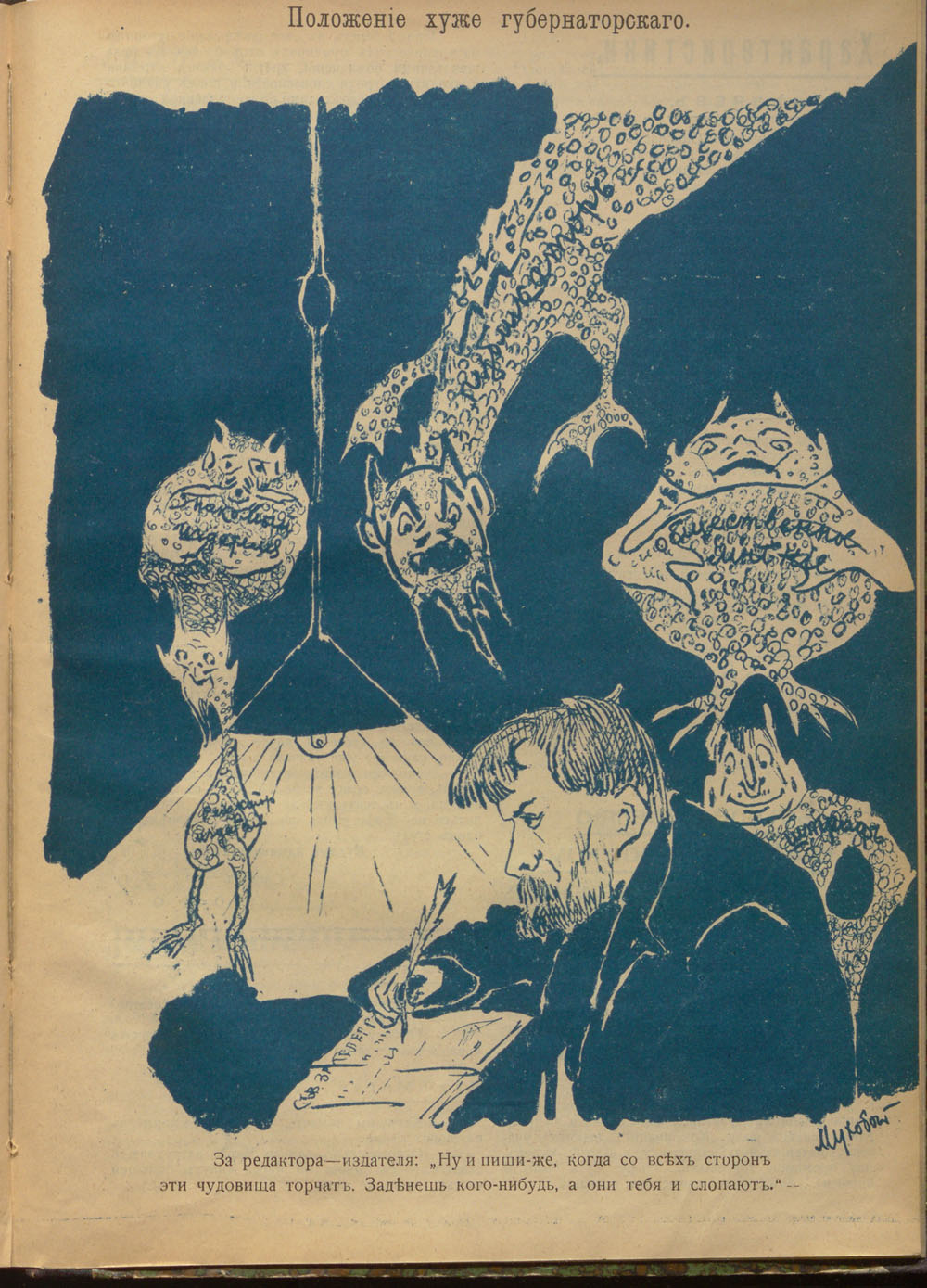 «Положение хуже губернаторского. За редактора-издателя: «Ну и пиши же, когда со всех сторон эти чудовища торчат (Редактор-издатель. Знакомый издателя. Публикатор. Общественное мнение. Штраф). Заденешь кого-нибудь, а они тебя и слопают»». Иллюстрация