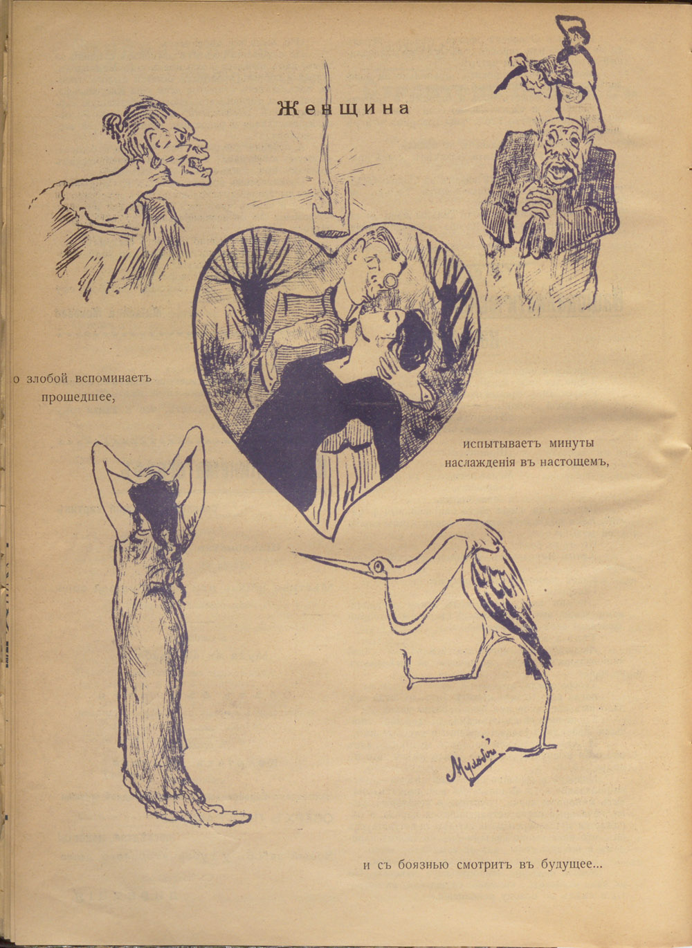 «Женщина. Со злобой вспоминает прошедшее, испытывает минуты наслаждения в настоящем, и с боязнью смотрит в будущее...» Иллюстрация В.Старевича из журнала «Ковенское зеркало».